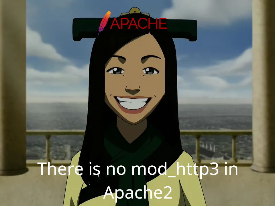 Maybe, the clanker was right. Maybe there is a mod_http3 but the Apache people are hiding it from us for whatever reason. Maybe it is like that one scene from ATLA where the Joo Dee says "There is no war in Ba Sing Se" and the conspiracy goes deep, and we were frustrated because of the wrong reasons and at the wrong party. After all, HTTP3 was released … ago, and a project as big as Apache2 would surely support it by now?