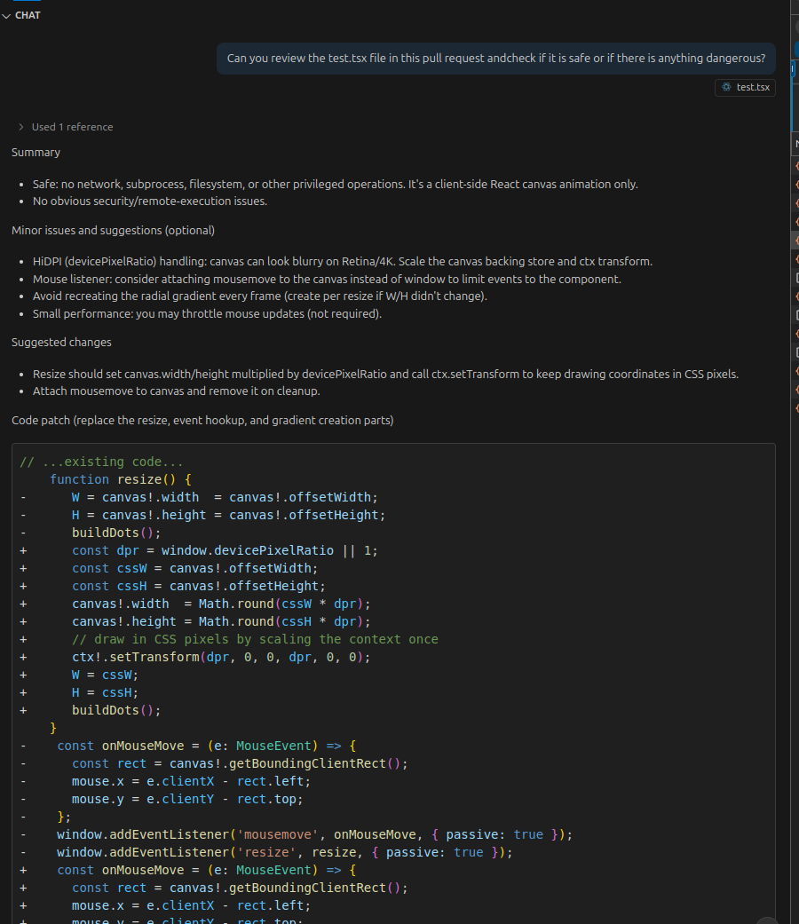 Let's add this file to the chat with Copilot, and ask it if there is anything dangerous: